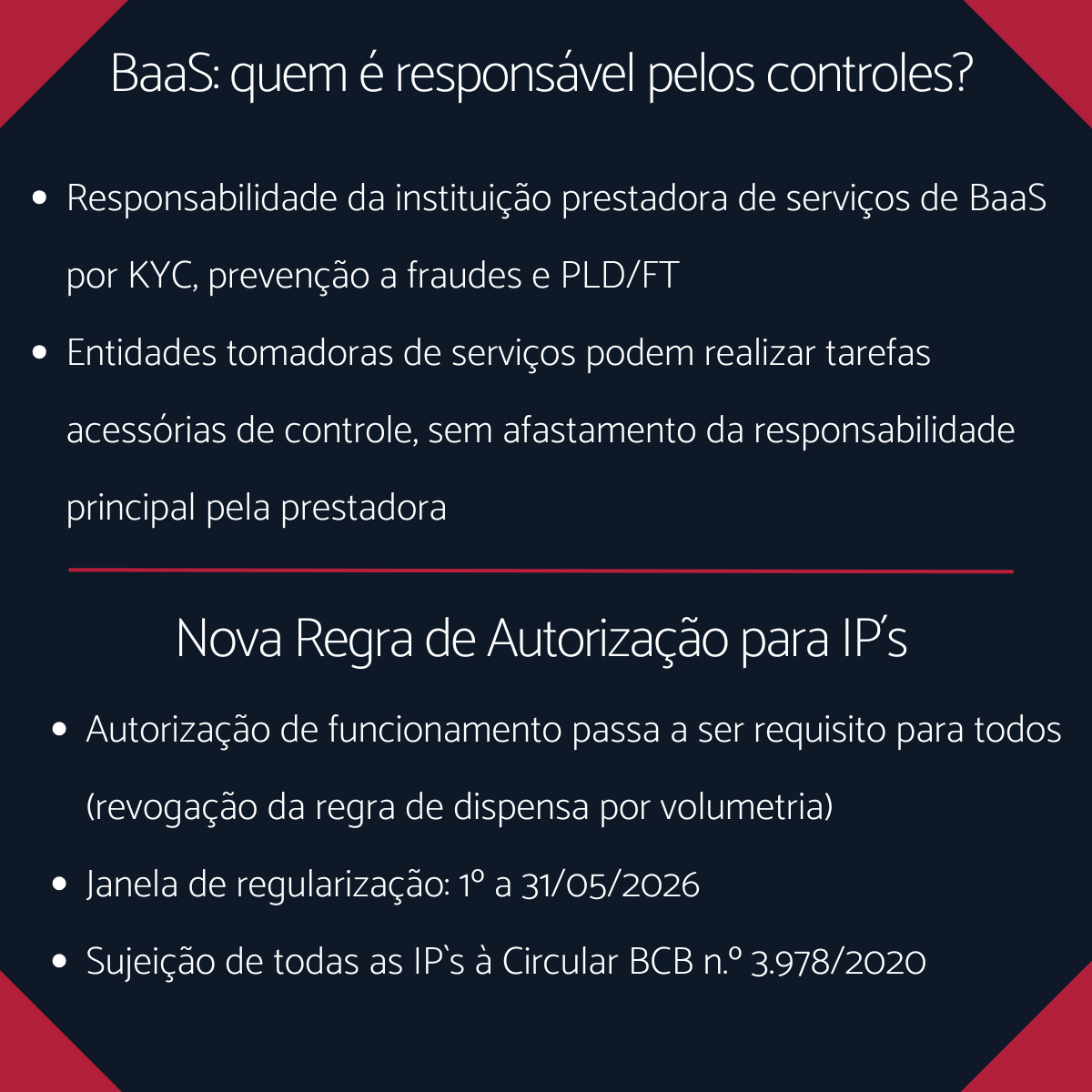Nesse contexto mais amplo, a Resolução BCB n.º 494/2025, ao alterar a Resolução BCB nº 80/2021, complementa o arcabouço ao fortalecer o regime regulatório aplicável às instituições de pagamento. A norma datada de 05/09/2025 passa a exigir autorização prévia para o início da prestação de serviços de pagamento, independentemente da modalidade, fortalecendo a supervisão sobre agentes relevantes do ecossistema de pagamentos. Com isso, ficam revogados os critérios anteriores de volumetria de transações de pagamento e de saldos mantidas em contas pré-pagas que permitiam a dispensa da autorização para funcionamento pelo BCB.