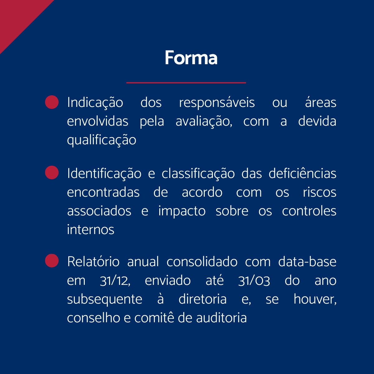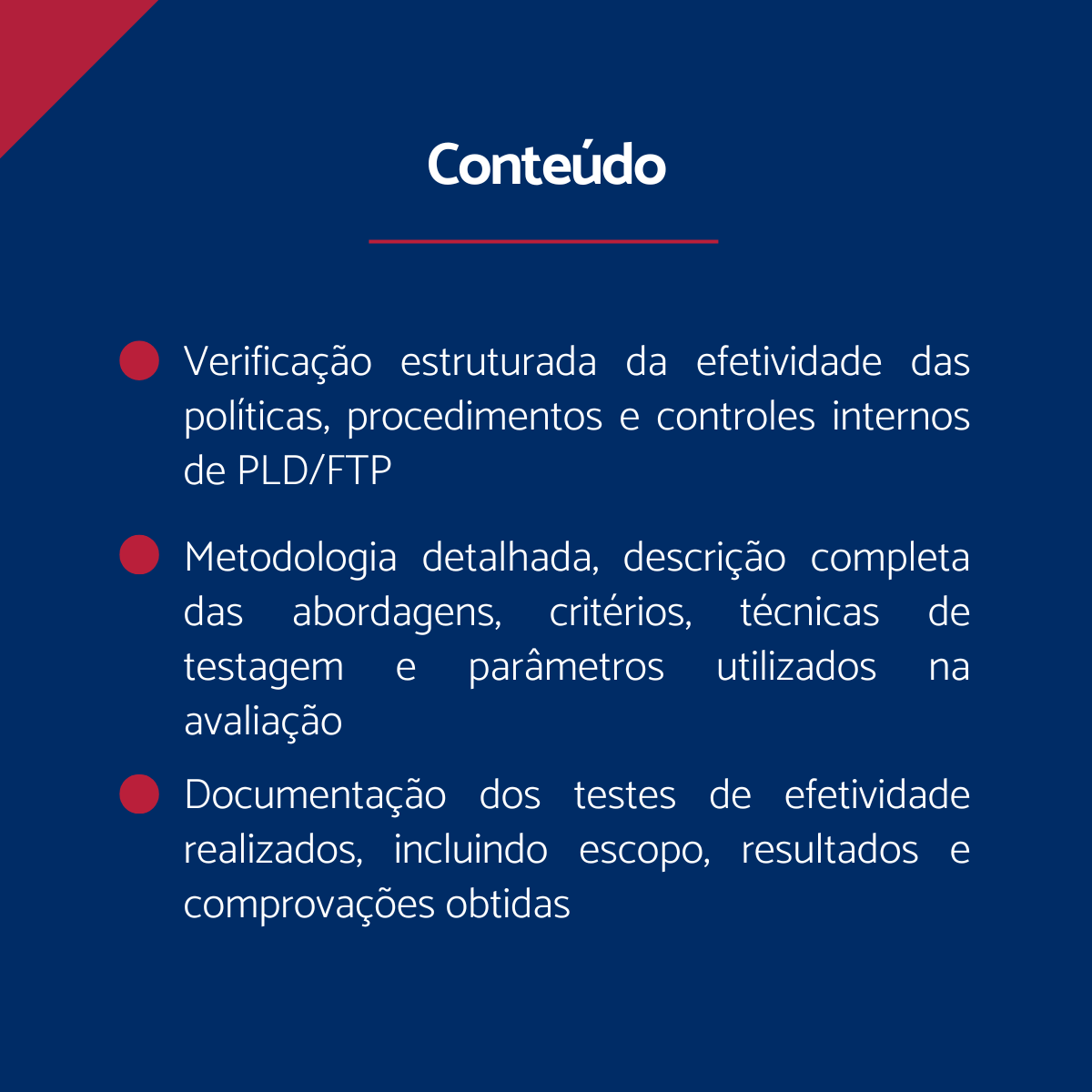 Dando concretude a essas exigências, os arts. 41 e 42 da Circular Susep nº 612/2020 detalham que a avaliação de efetividade deve envolver uma análise formal e periódica das políticas, dos procedimentos e dos controles internos de PLD/FT. Essa avaliação deve ser documentada em relatório específico, elaborado anualmente, com data-base em 31 de dezembro e encaminhada até 31 de março do ano subsequente à diretoria e, se houver, ao conselho de administração e ao comitê de auditoria. O relatório precisa apresentar, de forma clara e completa, a metodologia empregada, os testes realizados, a qualificação dos avaliadores e todas as deficiências identificadas ao longo do processo.